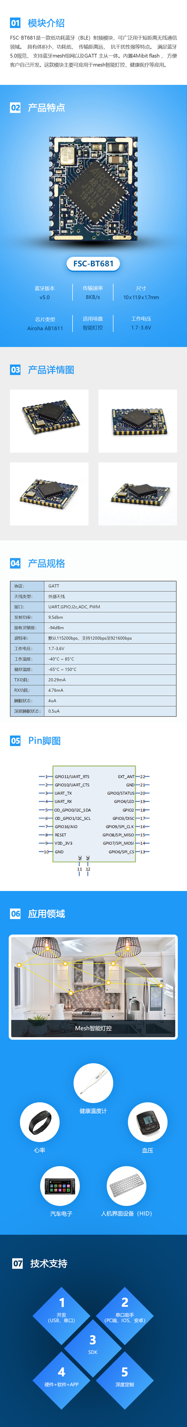 • 簡(jiǎn)介:FSC-BT681是一款低功耗藍(lán)牙(BLE) 射頻模塊,可廣泛用于短距離無線通信領(lǐng)域。具有體積小,功耗低,傳輸距離遠(yuǎn),抗干擾性強(qiáng)等特點(diǎn)。滿足藍(lán)牙5.0規(guī)范,支持藍(lán)牙m(xù)esh組網(wǎng)以及GATT主從-體。內(nèi)置...