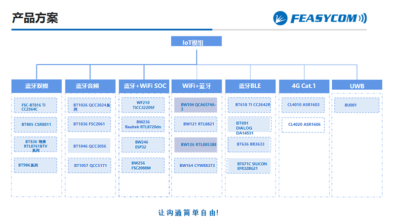 飛易通的產(chǎn)品線才能一開(kāi)始的單藍(lán)牙模塊發(fā)展到現(xiàn)在的藍(lán)牙BLE模塊、藍(lán)牙雙模模塊、藍(lán)牙音頻模塊、藍(lán)牙+WiFi模塊、SOC 藍(lán)牙+WiFi模塊、4G模塊,UWB模塊。