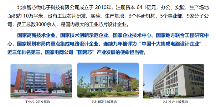 北京智芯微電子科技有限公司成立于2010年,注冊資本64.1億元,辦公、實(shí)驗(yàn)、生產(chǎn)場地面積約10萬平米,是國內(nèi)最大的工業(yè)芯片設(shè)計(jì)企業(yè)。同時(shí)也是國家高新技術(shù)企業(yè)、國家技術(shù)創(chuàng)新示范企業(yè)、國家企業(yè)技術(shù)中心、國家地方聯(lián)合工程研究中心,國家規(guī)劃布局內(nèi)重點(diǎn)集成電路設(shè)計(jì)企業(yè),連續(xù)九年被評為“中國十大集成電路設(shè)計(jì)企業(yè)”,近三年排名第三,國家電網(wǎng)公司“國網(wǎng)芯”產(chǎn)業(yè)發(fā)展的使命擔(dān)當(dāng)者。
