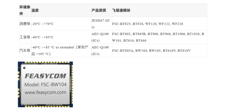 車(chē)規(guī)藍(lán)牙模塊的性能指標(biāo)包括藍(lán)牙基本指標(biāo)外,其中工作溫度是最能體現(xiàn)和商用藍(lán)牙的區(qū)分。車(chē)規(guī)藍(lán)牙模塊工作溫度范圍在-40度到85度,商用-20度到80度。車(chē)規(guī)藍(lán)牙模塊和工業(yè)模塊區(qū)別在于汽車(chē)級(jí)適用于惡劣環(huán)境條件下,尤其是汽車(chē)應(yīng)用。該設(shè)備可能會(huì)受到高水平的EMI、碰撞、沖擊和振動(dòng)以及極端溫度的影響。這些產(chǎn)品專(zhuān)為汽車(chē)、交通運(yùn)輸和其他關(guān)鍵任務(wù)應(yīng)用而設(shè)計(jì),符合行業(yè)標(biāo)準(zhǔn)汽車(chē)規(guī)范,經(jīng)過(guò)車(chē)規(guī)認(rèn)證才可以稱(chēng)為車(chē)規(guī)模塊